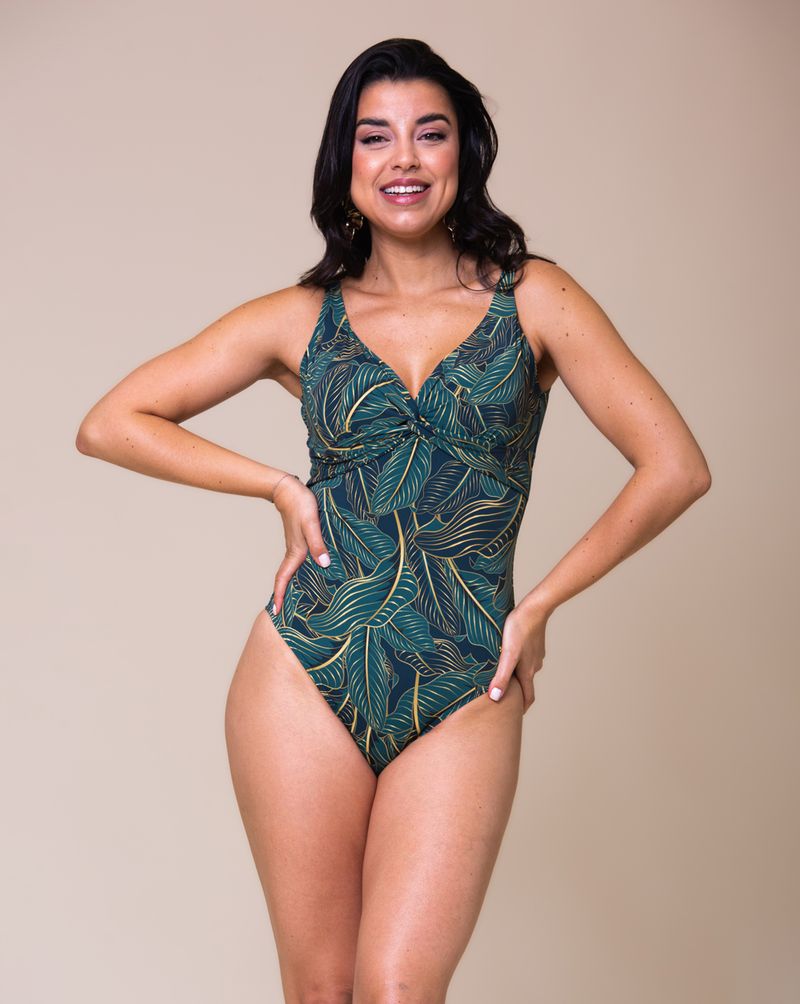 Maiô decote em V transpassado no busto com bojo removível, alças largas e decote em U profundo nas costas.