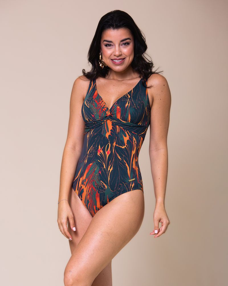 Maiô decote em V transpassado no busto com bojo removível, alças largas e decote em U profundo nas costas.